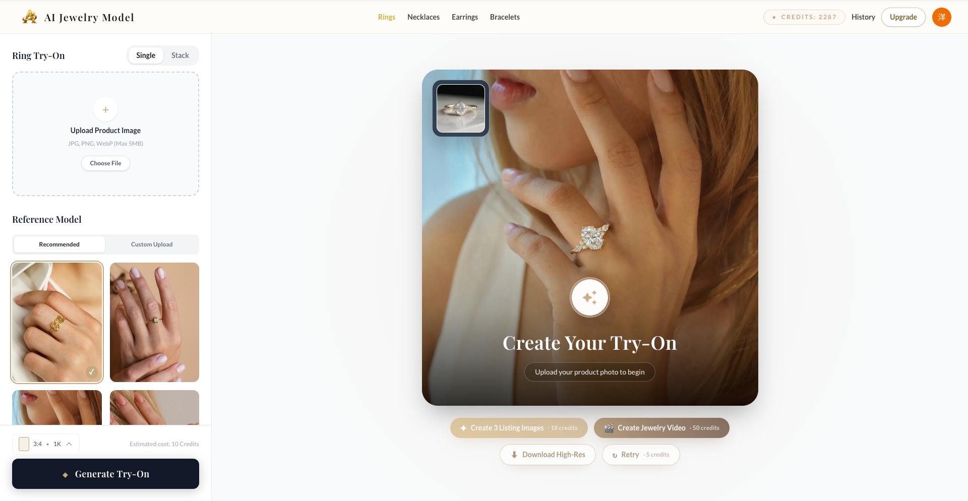 AI jewelry try-on photos and videos for Etsy and Shopify sellers.