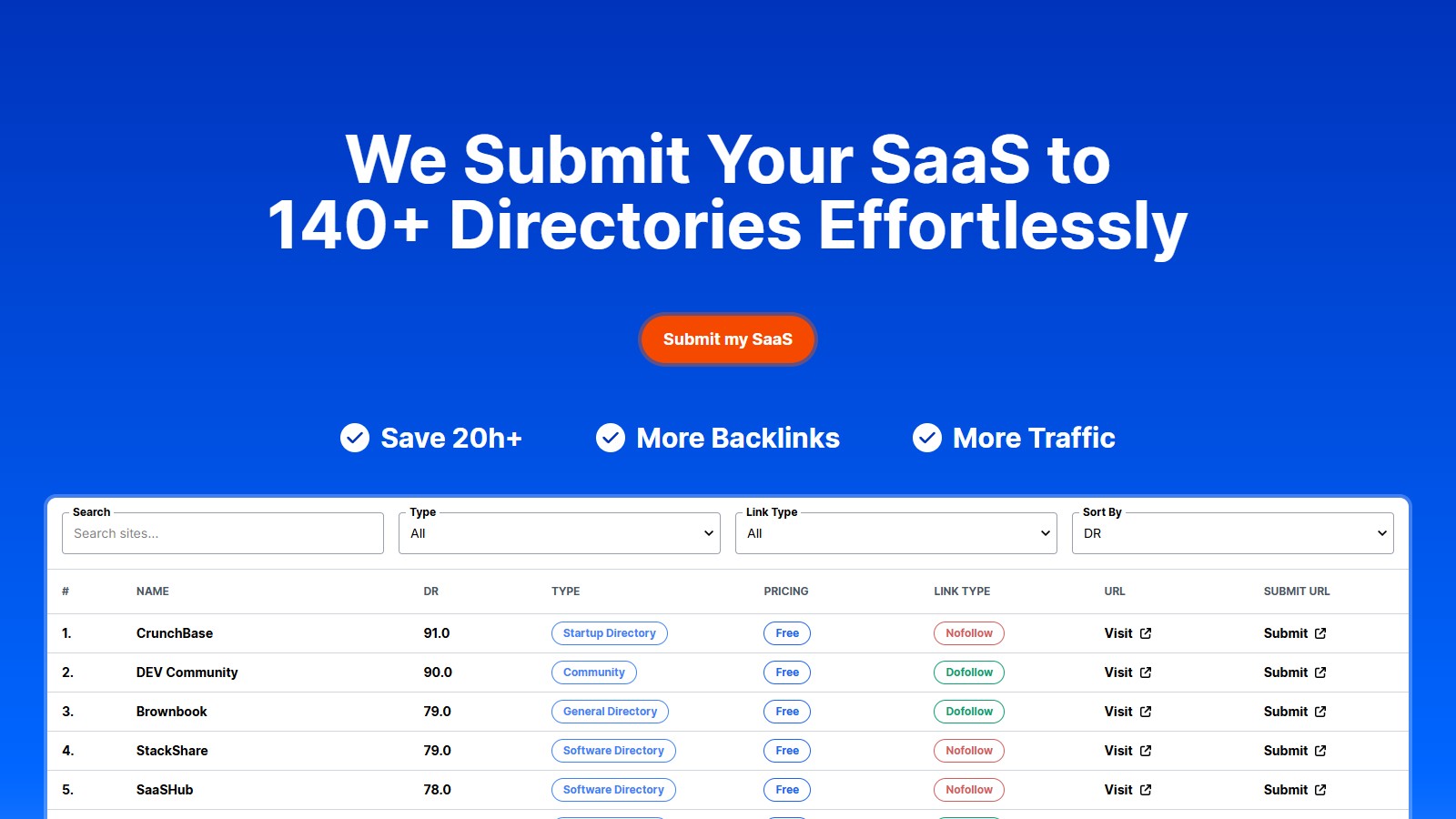 Increase your SaaS visibility by submitting to 140+ directories. Save time, gain high-quality backlinks, and grow your reach with minimal effort.